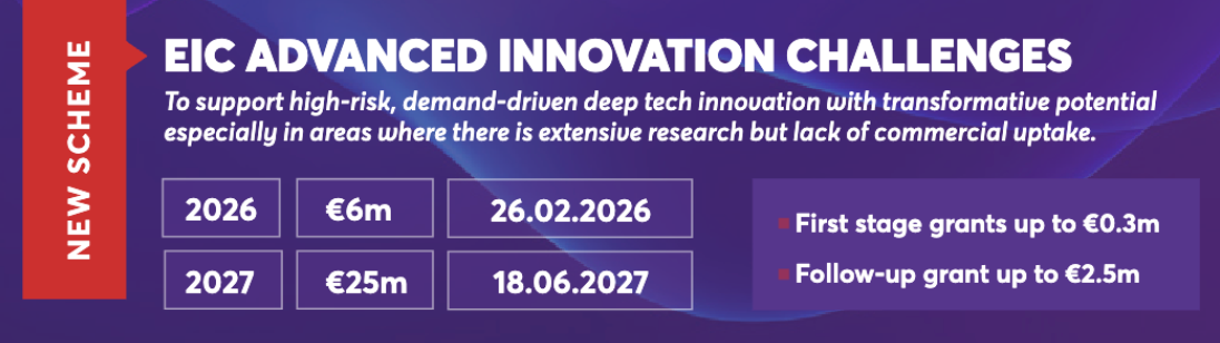 Európska inovačná rada (EIC) v rámci pracovného programu na rok 2026 spúšťa nový pilotný program EIC Advanced Innovation Challenges, zameraný na podporu odvážnych, vysoko rizikových technologických inovácií s výrazným transformačným potenciálom.