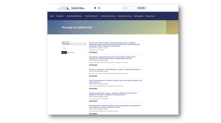 Ak sa plánujete zapojiť do výziev Klastra 5: Klíma, energetika a mobilita, ktoré sa otvorili 18. decembra 2025 a hľadáte vhodného partnera alebo konzorcium, Národná kancelária Horizontu pre Vás priebežne zbiera a sprístupňuje ponuky na spoluprácu na jednom mieste na svojom webe.