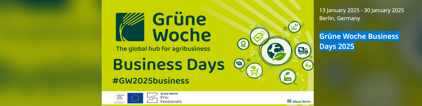 Enterprise Europe Network Berlín-Brandenbursko a ďalší partneri vás pozývajú na medzinárodné matchmakingové podujatie Grüne Woche Business Days 2025 zamerané na moderné poľnohospodárstvo a výživu. Podujatie sa bude konať počas veľtrhu. Podujatie sa bude konať počas veľtrhu Grüne Woche v Nemecku a online.