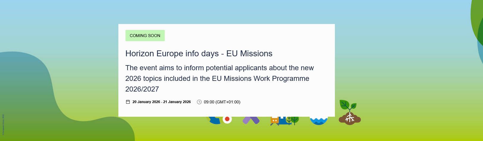Pridajte sa online 10. - 21. januára 2026 o 9:00 a zistite viac o nových témach pre rok 2026 v časti Missions hlavného pracovného programu Horizon Europe 2026/2027 pre jednotlivé misie: