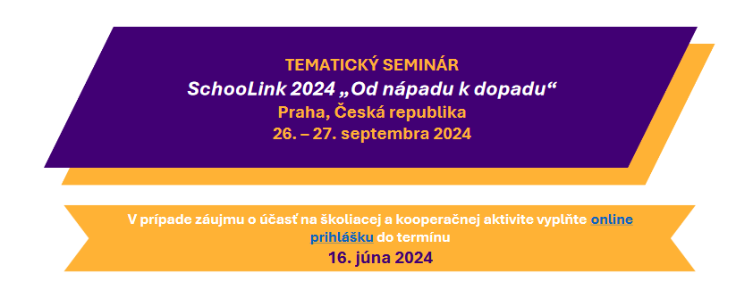 Tematický seminár SchooLink 2024 „Od nápadu k dopadu“ sa bude konať v Prahe 26.-27.9.2024. Je určený pre záujemcov zo sektora školského vzdelávania. Vítané sú školy, ktoré sú skúsené v programe Erasmus+ (realizátori projektov KA121/KA122 a/alebo projektov KA2).