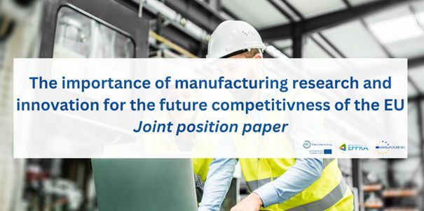 EFFRA, ManuFuture a EIT Manufacturing podpísali 9. októbra 2024 spoločný dokument, ktorý zdôrazňuje význam investícií do výskumu a inovácií na zabezpečenie dlhodobej konkurencieschopnosti, udržateľnosti a technologickej nezávislosti regiónu. Táto spolupráca si vyžaduje jednotný prístup k využívaniu potenciálu výskumu a inovácií v celej Európe s dôrazom na jeho vplyv na priemyselný rast a odolnosť.