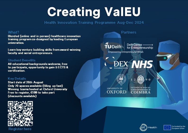 Creating ValEU je inovačný vzdelávací program EIT Health, ktorý prepája podnikateľské myslenie, výskum a prax v oblasti Value-Based Health Care (VBHC) – hodnotovo orientovanej zdravotnej starostlivosti. Program je certifikovaný Európskou komisiou a vedený inštitúciami ako University of Oxford, TU Delft, Medical University of Łódź či University of Barcelona.