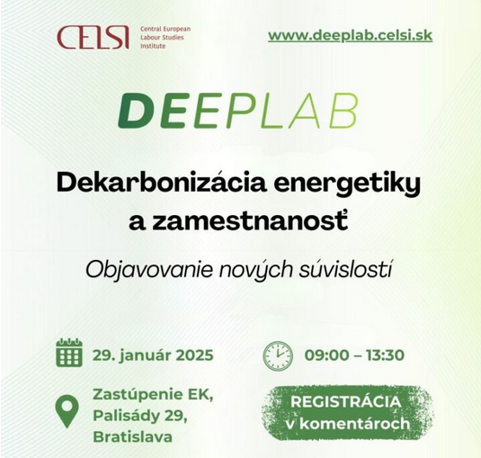 Stredoeurópsky inštitút pre výskum práce (CELSI) organizuje odborné podujatie „Dekarbonizácia energetiky a zamestnanosť – objavovanie nových súvislostí“, na ktorom budú predstavené výsledky výskumu z projektu DEEPLAB a otvorená diskusia o dopadoch zelenej transformácie na trh práce v oblasti energetiky.