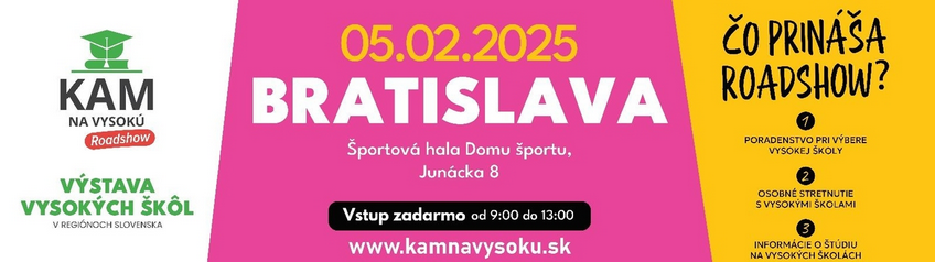 Výstava Kam na vysokú pomáha študentom zorientovať sa v možnostiach štúdia a budúcej kariéry. Ponúka informácie o slovenských a českých vysokých školách, študijných programoch a podmienkach štúdia v zahraničí. Zároveň sa na nej prezentujú zamestnávatelia s ponukami brigád, stáží aj pracovných miest pre študentov.