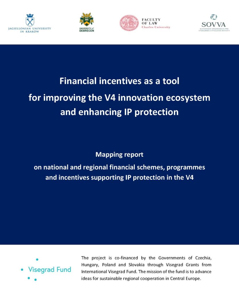Konečným výstupom projektu „Finančné stimuly ako nástroj na zlepšenie inovačného ekosystému krajín V4 a podporu ochrany duševného vlastníctva (V4IP)“ je správa o zmapovaní národných a regionálnych finančných schém na podporu ochrany duševného vlastníctva v krajinách V4, pripravená ako výsledok projektovej činnosti.