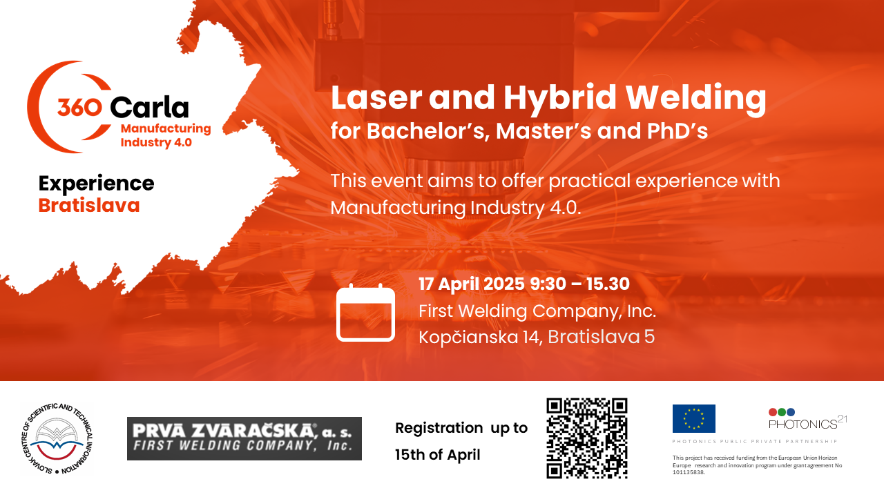 Centrum vedecko-technických informácií SR v spolupráci s Prvou zváračskou, a. s. organizuje podujatie v rámci projektu CARLA 360. Cieľom tohto podujatia je ponúknuť praktickú skúsenosť s výrobným priemyslom 4.0 – Laserové a hybridné zváranie. Podujatie je určené pre študentov a absolventov vysokých škôl, ktorí sa zaujímajú o Laserovú techniku.