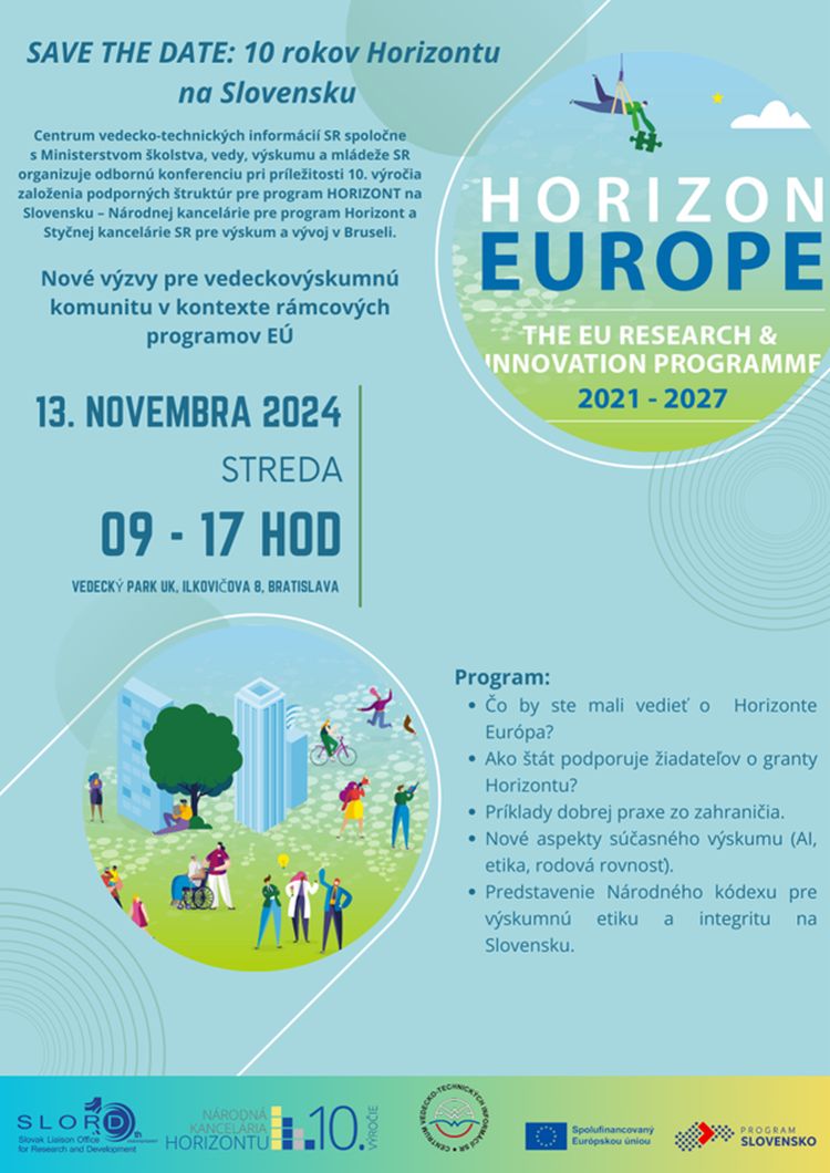 Centrum vedecko-technických informácií SR spoločne s Ministerstvom školstva, vedy, výskumu a mládeže SR organizuje odbornú konferenciu pri príležitosti 10. výročia založenia podporných štruktúr pre program HORIZONT na Slovensku – Národnej kancelárie pre program Horizont a Styčnej kancelárie SR pre výskum a vývoj v Bruseli s názvom Nové výzvy pre vedeckovýskumnú komunitu v kontexte rámcových programov EÚ.