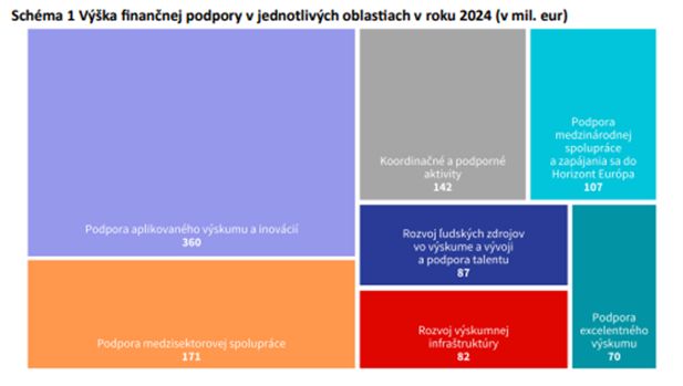 Najviac financií smeruje do podpory aplikovaného výskumu a inovácií. Tento údaj nezahŕňa podporu pri výzvach, kde zatiaľ nebola stanovená indikatívna alokácia. Schéma č. 1 približuje štruktúru podľa oblastí podpory v roku 2024.
