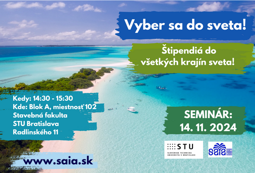 SAIA, n.o. vás pozýva na seminár Štipendiá do všetkých krajín sveta! Vyber sa do sveta! Jedná sa o študijné, výskumné a jazykové pobyty pre študentov, doktorandov a vysokoškolských učiteľov. Podujatie je určené pre študentov, doktorandov, vysokoškolských učiteľov a výskumných pracovníkov , ktorí majú záujem vycestovať do zahraničia na študijné, výskumné alebo jazykové pobyty.