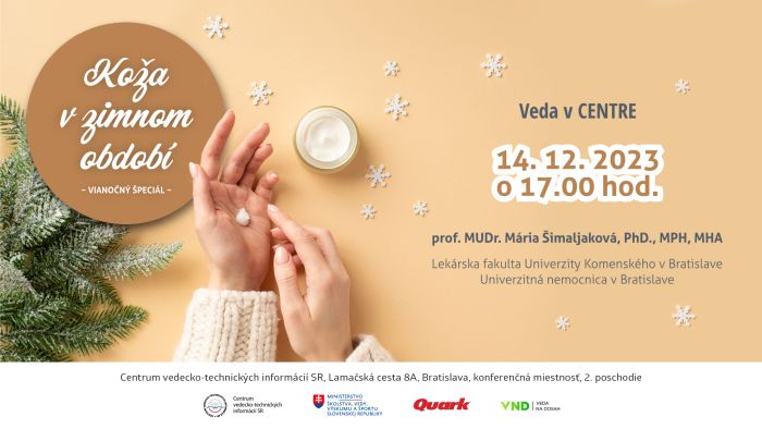 Chladné a sychravé počasie v kontraste so suchými prekúrenými miestnosťami sú záťažovým testom odolnosti každej pleti. Ako teda máme ošetrovať pokožku v zime a akú starostlivosť treba zvoliť pri kožných ochoreniach? Prečo nás trápi vypadávanie vlasov? Ako ochránime pokožku pred vplyvmi, ako je vietor, mráz a slnečné žiarenie? Odpovede na tieto otázky sa dozvieme vo Vede v CENTRE vo štvrtok 14. decembra 2023 o 17.00 hod. v CVTI SR na Lamačskej ceste 8A v Bratislave. Našou hostkou bude dermatologička prof. MUDr. Mária Šimaljaková, PhD., MHA, MPH, z Lekárskej fakulty Univerzity Komenského v Bratislave a z Univerzitnej nemocnice Bratislava.