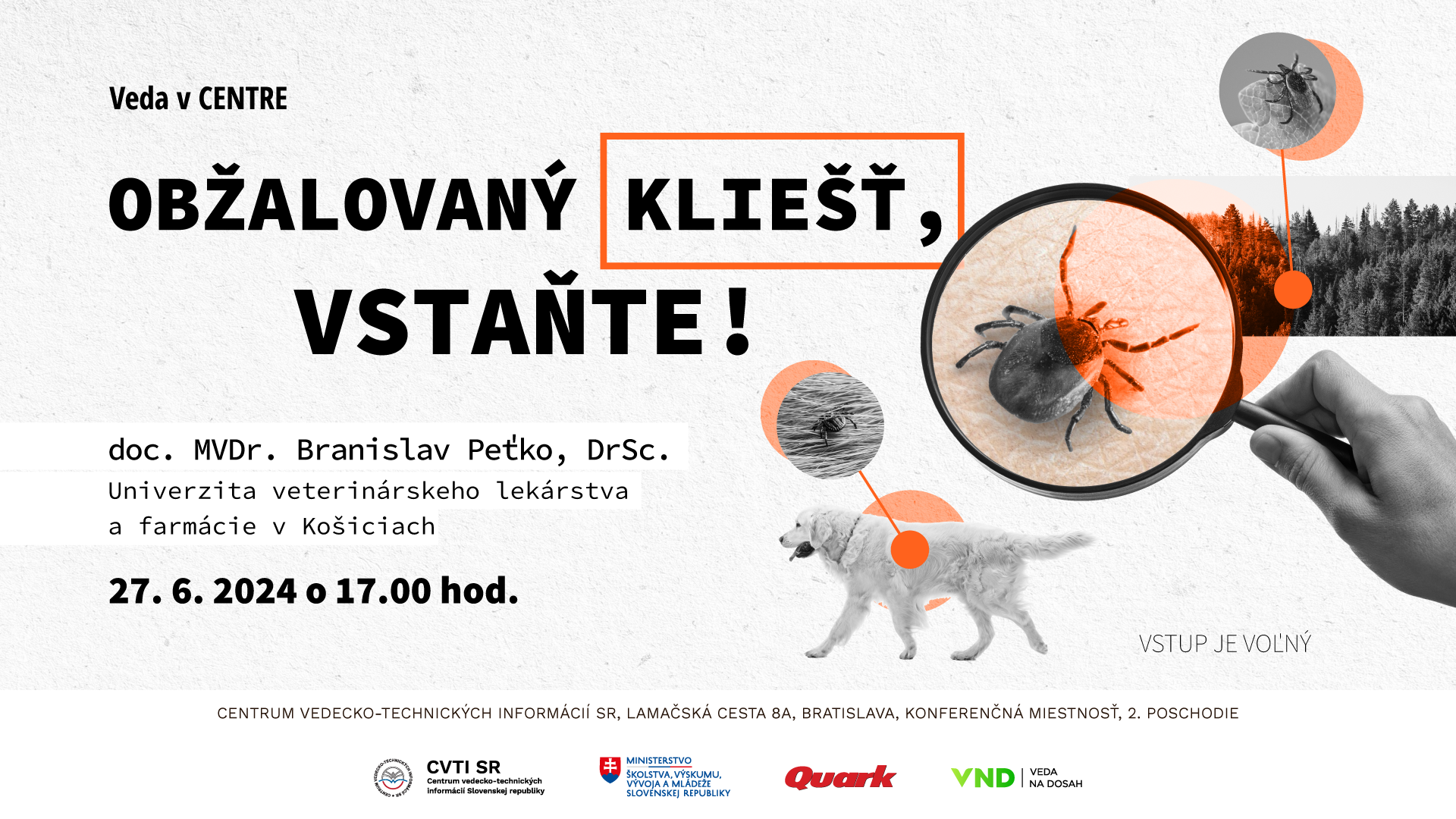 Kliešte sa najčastejšie vyskytujú v tráve, lístí a na nízko rastúcich rastlinách, kde čakajú na svojho hostiteľa, ktorého napadnú. Aj preto musíme byť pri pobyte v lese, parku, ale aj v záhrade obozretní. Ako sa kliešte šíria a aké choroby môžu prenášať? Ako vieme minimalizovať riziko kliešťových napadnutí? Prečo je pre človeka borelióza taká nebezpečná a prečo sa vyskytuje v organizme približne každého tretieho kliešťa? Ako treba postupovať, keď si nájdeme kliešťa, a ako ho odstrániť, aby nedošlo k prenosu chorôb? Odpovede nielen na tieto otázky sa dozvieme vo Vede v CENTRE.