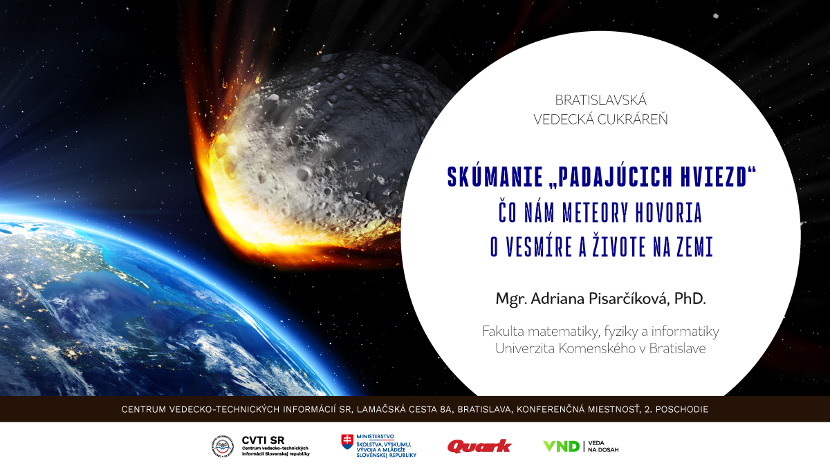 Meteoroidy – úlomky z asteroidov a komét – v sebe ukrývajú cenné informácie o pozostatkoch z čias formovania našej slnečnej sústavy. V súčasnosti najviac poznatkov o ich zložení poznáme z výskumu zloženia meteoritov, nájdených na Zemi, lenže ich nálezy sú zriedkavé a svojím zložením predstavujú prevažne asteroidálny materiál. Na prednáške si povieme, akým spôsobom skúmame zloženie meteoroidov na diaľku a aké sú limity nášho výskumu. Dozvieme sa, ktoré spektrálne znaky indikujú prítomnosť vody a organických zlúčenín ako dôležitých prispievateľov k vzniku života na Zemi. Súčasťou prednášky budú aj videá simulovaného preletu meteoroidu zemskou atmosférou. Na túto simuláciu výskumníci využili vzorky meteoritov, získané v rámci laboratórneho experimentu v Inštitúte vesmírnych systémov na Univerzite v Stuttgarte, ktoré spálili v plazmovom veternom tuneli.