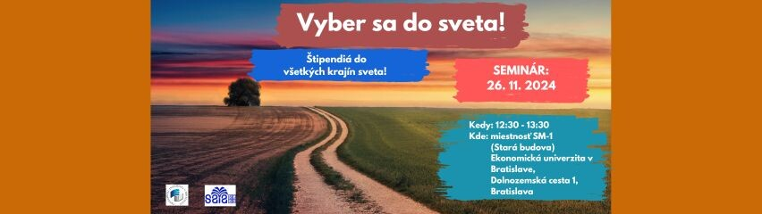 SAIA, n. o. Vás v spolupráci s Rektorátom Ekonomickej univerzity v Bratislave pozýva na seminár o štipendijných možnostiach: Vyber sa do sveta! Štipendiá do všetkých krajín sveta! SAIA ponúka študijné, výskumné a jazykové pobyty pre študentov, doktorandov a vysokoškolských učiteľov. Podujatie je určené pre študentov, doktorandov, vysokoškolských učiteľov a výskumných pracovníkov , ktorí majú záujem vycestovať do zahraničia na študijné, výskumné alebo jazykové pobyty.