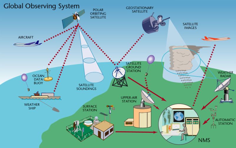 Atmosféru nepretržite pozoruje viac ako 40 satelitov, tisíce pozemných pozorovacích staníc a lietadlá, lode a balóny. Merajú parametre atmosféry, ako je teplota, oblačnosť a vietor, a tiež zložky atmosféry, ako je ozón, oxid uhoľnatý, aerosóly, aj parametre zemského povrchu.