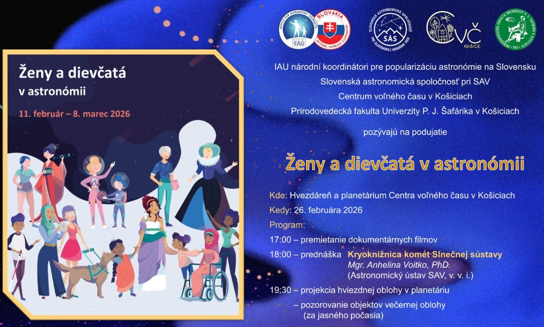 Iniciatívu IAU Ženy a dievčatá v astronómii predstaví Poradca národného koordinátora pre popularizáciu astronómie IAU na Slovensku doc. RNDr. Rudolf Gális, PhD. (Prírodovedecká fakulta Univerzity P. J. Šafárika v Košiciach). - Program bude pokračovať prednáškou Kryoknižnica komét Slnečnej sústavy, ktorú prednesie Mgr. Anhelina Voitko, PhD. (Astronomický ústav SAV, v. v. i., Tatranská Lomnica).